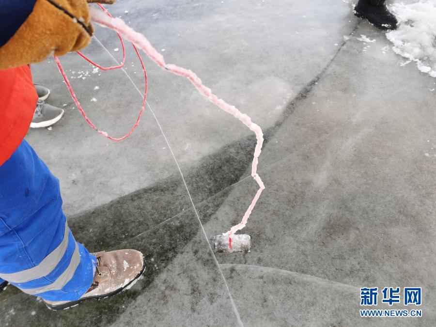 另外一名同事拿出測(cè)量繩,放入冰孔中,記錄下水深數(shù)據(jù)?!翱粗烎~似的,但我們‘釣’上來(lái)的是保障橋梁安全的數(shù)據(jù)。”史慶龍介紹,他們每年冬天需要在這座橋下兩側(cè)和正下方鉆出數(shù)百個(gè)冰孔。