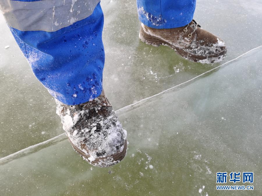 1月13日,橋隧工的棉鞋被江水打濕,結(jié)冰。新華社記者王君寶 攝