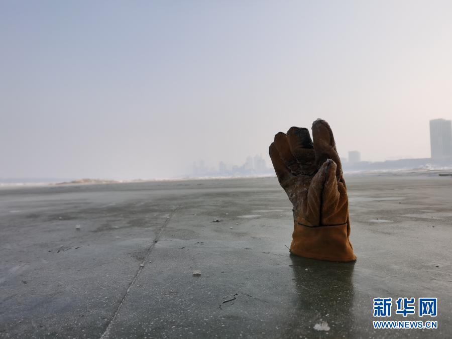 1月13日,橋隧工的手套被江水打濕,結(jié)冰后立在江面上。新華社記者王君寶 攝