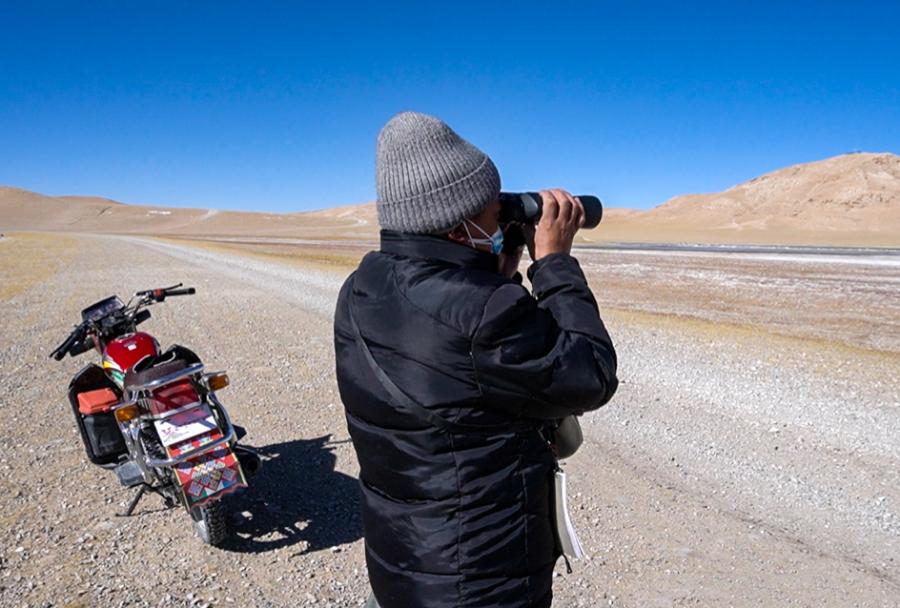 次成塔青拿著望遠鏡觀察遠方(2021年2月攝)。 新華社記者 田金文 攝