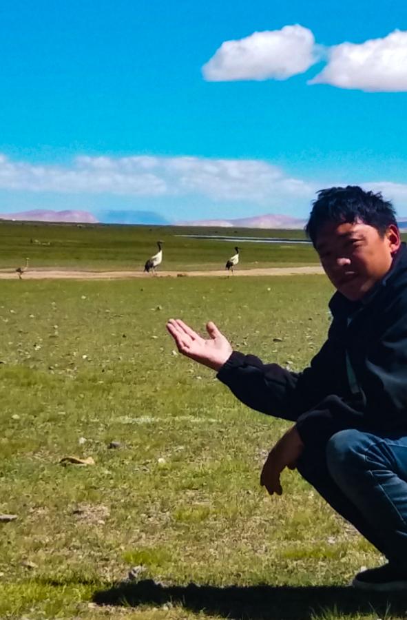 次成塔青和黑頸鶴合影(2020年6月攝)。(受訪者供圖)