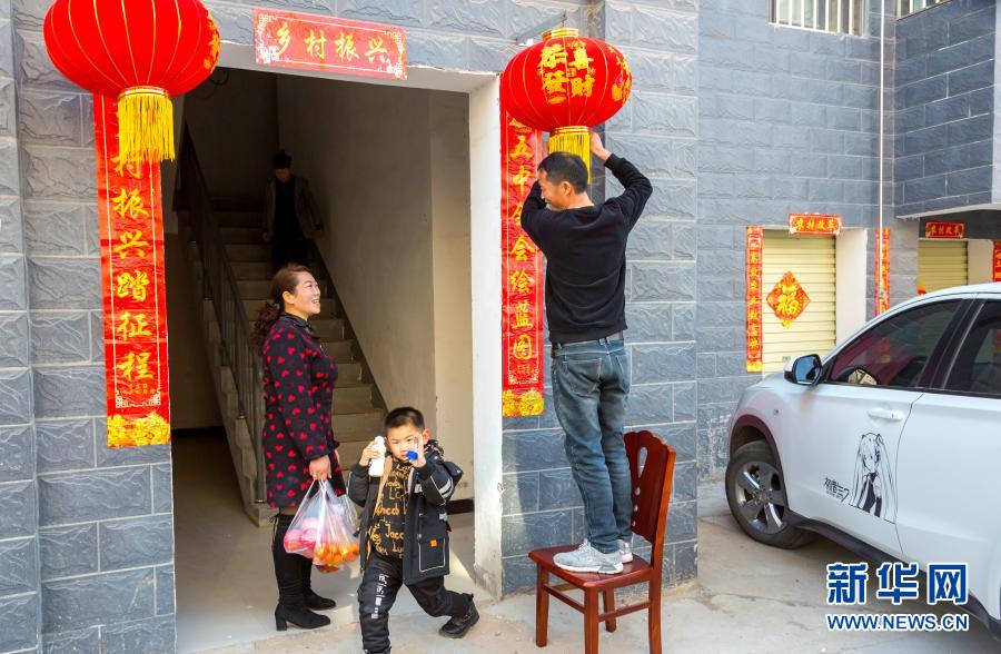 在河南省新鄉(xiāng)市封丘縣李莊鎮(zhèn)前辛莊社區(qū),杜英慧(前左)從社區(qū)超市買菜回來,丈夫(右)在樓下掛燈籠(2月11日攝)。新華社發(fā)(孫慶軍 攝)