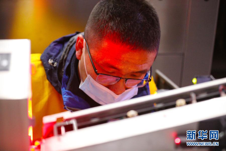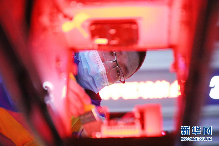 在鄭州東站,中國(guó)鐵路鄭州局集團(tuán)有限公司科學(xué)技術(shù)研究所設(shè)備維保員趙牧童在維護(hù)高鐵站設(shè)備(2020年12月30日攝)。新華社發(fā)