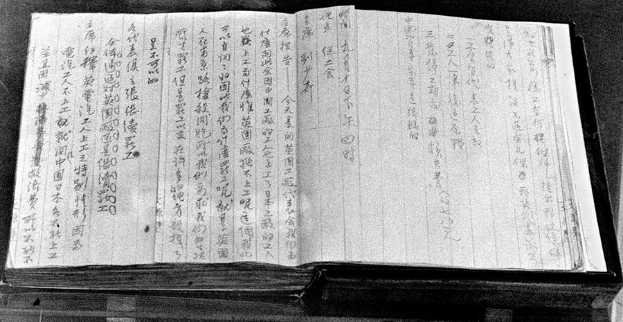 圖為五卅運(yùn)動(dòng)期間劉少奇同志召集上海英國(guó)工廠(chǎng)工人代表開(kāi)會(huì)的一份會(huì)議記錄,會(huì)議一致通過(guò)對(duì)英國(guó)工廠(chǎng)繼續(xù)罷工 新華社圖片