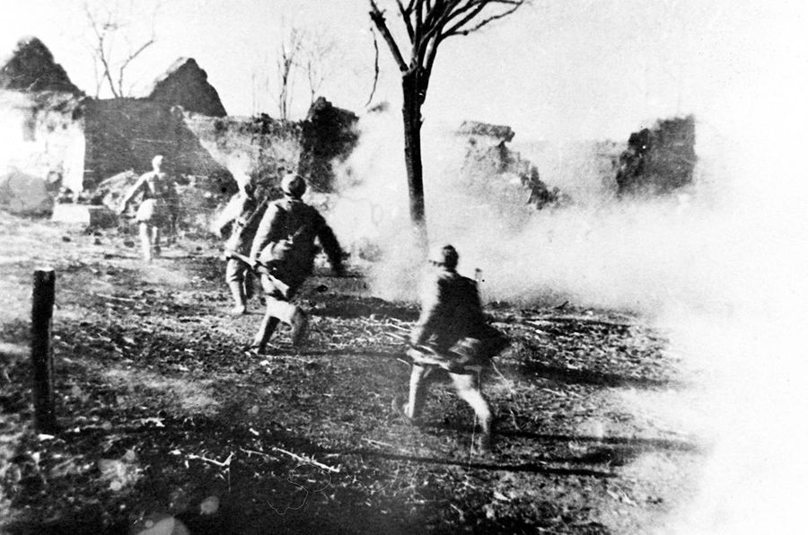 在淮海戰(zhàn)役中,人民解放軍突破濃煙密火,撲向國(guó)民黨軍的指揮所魯樓。 新華社圖片