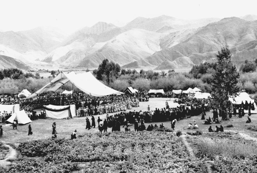 1951年9月,人民解放軍入藏先遣部隊抵達拉薩城郊。西藏地方政府在拉薩河畔搭起了巨大的白色帳篷,設(shè)立了十里長亭,隆重?zé)崃覛g迎解放軍入城。 新華社圖片