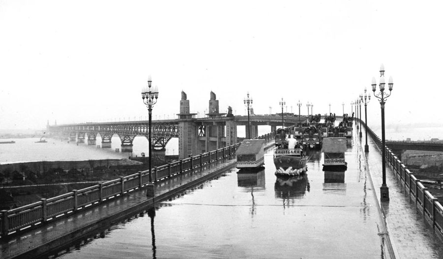 1968年12月29日,南京市5萬多軍民歡聚在江邊橋頭,隆重舉行大會,慶祝南京長江大橋全面建成。慶祝大會結(jié)束后,紅色的信號彈騰空而起,在一片鞭炮和鑼鼓聲中,100多輛滿載南京群眾代表的彩車徐徐通過公路橋。頓時,大江南北,橋上橋下,車內(nèi)車外,一片歡騰,歡呼聲震撼大地,響徹云霄。