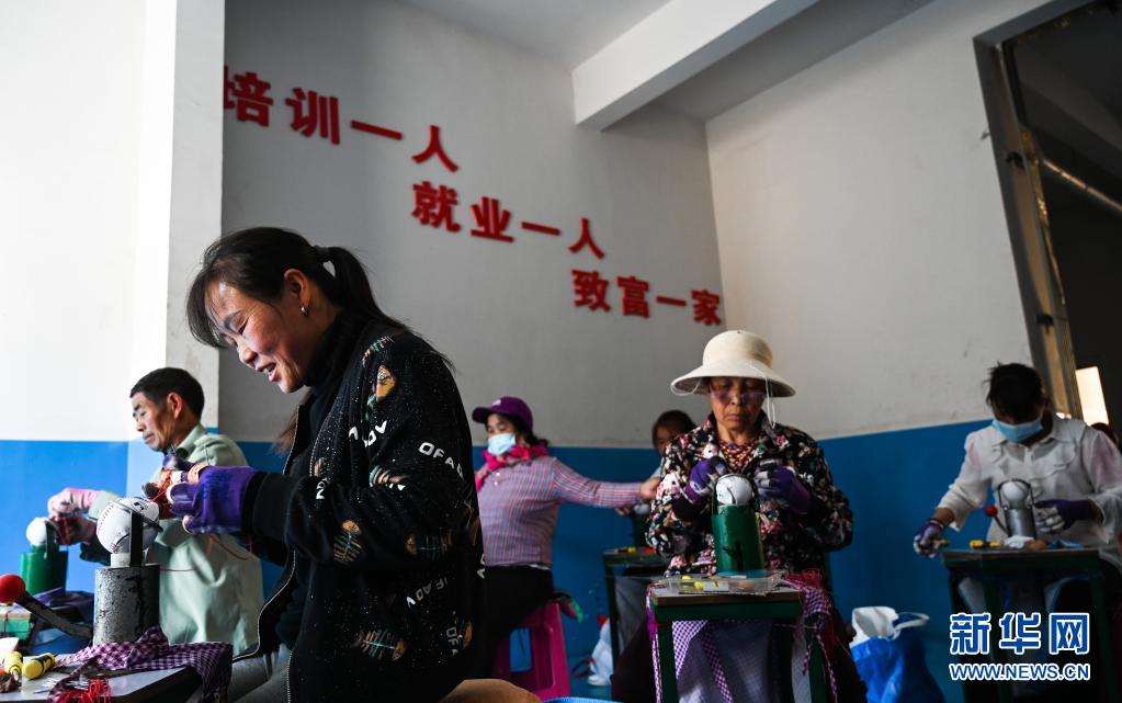 4月26日,搬遷群眾在云南會澤新城搬遷安置點(diǎn)棒球制作車間內(nèi)工作。新華社記者 王冠森 攝