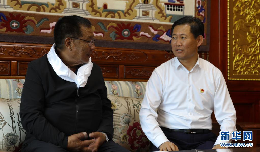 7月6日,張峰(右)與青海省海南藏族自治州共和縣恰卜恰鎮(zhèn)索吉亥村村民華旦交流。新華社記者 央秀達珍 攝