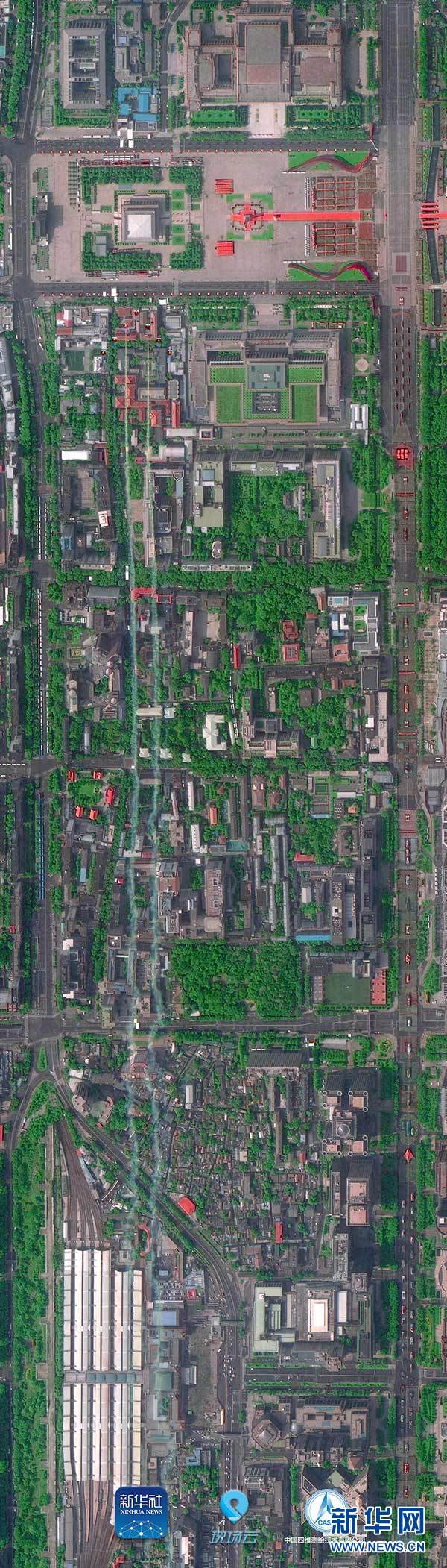 這是“高景1號”拍攝的拉出彩煙的空中梯隊即將通過天安門廣場上空(10月1日攝)。 10月1日上午,慶祝中華人民共和國成立70周年大會在北京天安門廣場隆重舉行。新華社聯(lián)合多家單位調(diào)用多顆國產(chǎn)衛(wèi)星俯瞰閱兵,從“最高機位”發(fā)回這三張珍貴的長安街全畫幅衛(wèi)星圖。 新華社發(fā)(中國四維測繪技術有限公司提供)