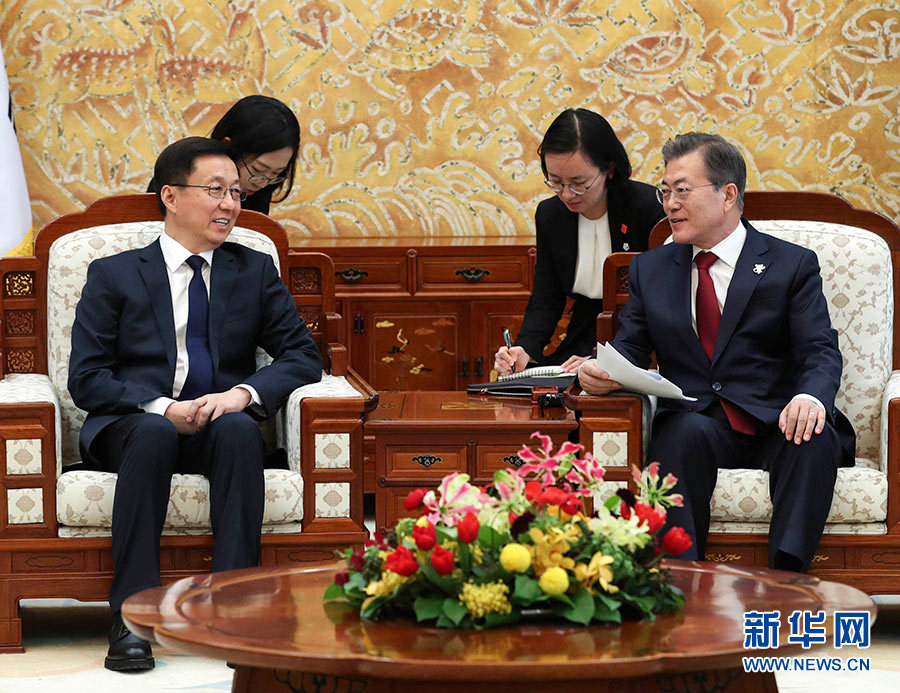 新華社韓國(guó)平昌2月9日電(記者駱珺 耿學(xué)鵬)當(dāng)?shù)貢r(shí)間2月8日下午,應(yīng)邀出席韓國(guó)平昌冬奧會(huì)開(kāi)幕式的習(xí)近平主席特別代表、中共中央政治局常委韓正在首爾青瓦臺(tái)會(huì)見(jiàn)韓國(guó)總統(tǒng)文在寅。