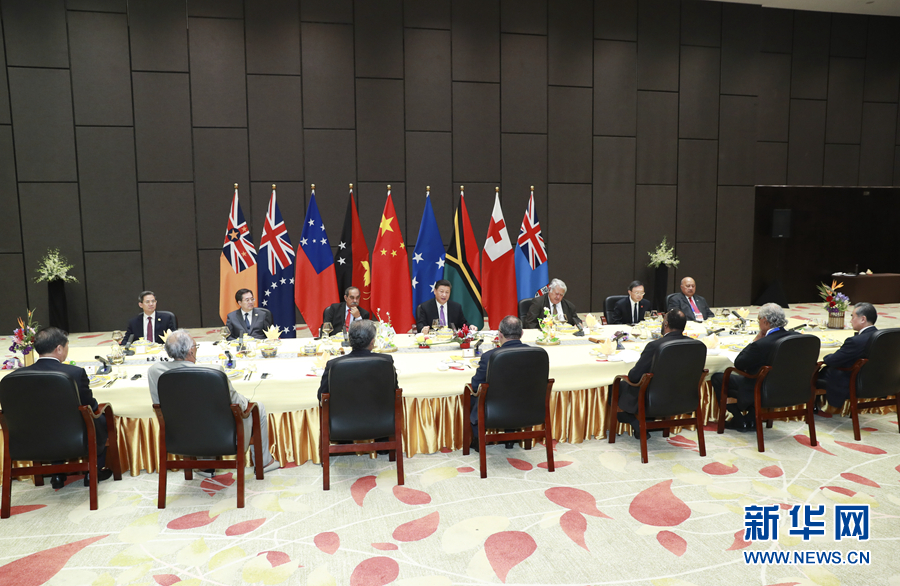 11月16日,國(guó)家主席習(xí)近平在莫爾茲比港同巴布亞新幾內(nèi)亞總理奧尼爾、密克羅尼西亞聯(lián)邦總統(tǒng)克里斯琴、薩摩亞總理圖伊拉埃帕、瓦努阿圖總理薩爾瓦伊、庫(kù)克群島總理普納、湯加首相波希瓦、紐??偫硭冉ń惶窖髰u國(guó)領(lǐng)導(dǎo)人以及斐濟(jì)政府代表、國(guó)防部長(zhǎng)昆布安博拉舉行集體會(huì)晤。習(xí)近平主持會(huì)晤并發(fā)表主旨講話。 新華社記者 龐興雷 攝