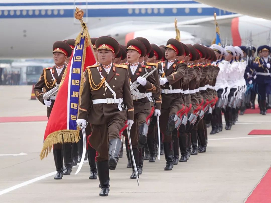 朝方在機(jī)場舉行隆重歡迎儀式。在21響禮炮聲中,軍樂隊(duì)奏中朝兩國國歌,習(xí)近平在金正恩陪同下檢閱了朝鮮人民軍三軍儀仗隊(duì),并觀看了分列式表演。