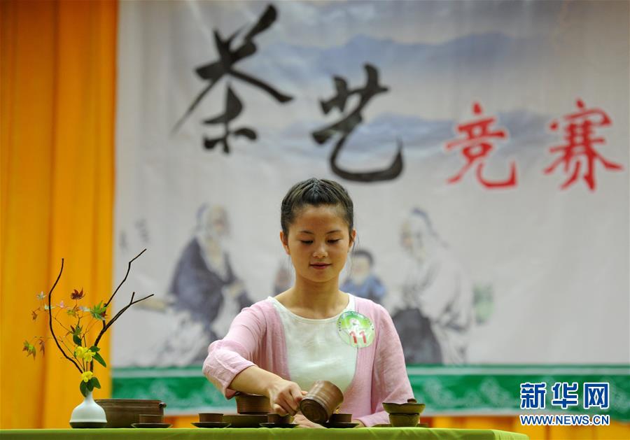 參賽選手在貴陽市第二屆技能之星競技大賽決賽茶藝展示比賽中(2015年11月17日攝)。大賽吸引5000余名來自貴州省中、高等職業(yè)院校的學(xué)生參加。新華社記者 陶亮 攝