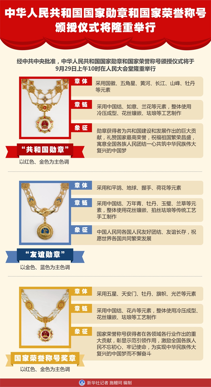 經(jīng)中共中央批準(zhǔn),中華人民共和國國家勛章和國家榮譽(yù)稱號頒授儀式將于9月29日上午10時(shí)在北京人民大會堂隆重舉行。 這是“友誼勛章”。 新華社發(fā)