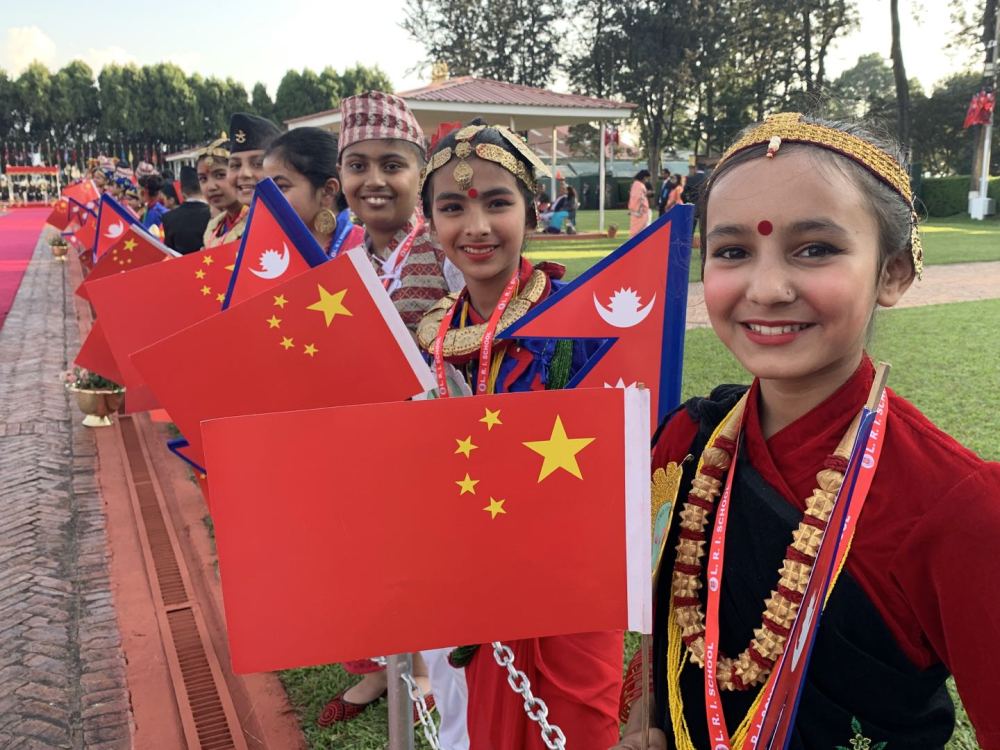 2019年10月12日,尼泊爾首都加德滿都特里布萬國際機場,尼泊爾孩子們站在紅地毯一側(cè),熱烈歡迎中國國家主席習(xí)近平來訪。新華社記者高潔攝
