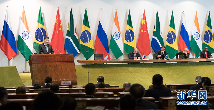 當(dāng)?shù)貢r間11月14日,金磚國家領(lǐng)導(dǎo)人同金磚國家工商理事會和新開發(fā)銀行對話會在巴西利亞舉行。中國國家主席習(xí)近平、巴西總統(tǒng)博索納羅、俄羅斯總統(tǒng)普京、印度總理莫迪、南非總統(tǒng)拉馬福薩共同出席。這是習(xí)近平發(fā)表講話。 新華社記者 王曄 攝