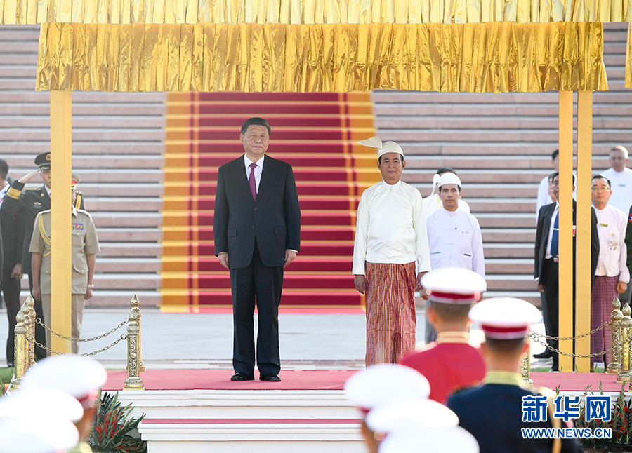 當?shù)貢r間1月17日下午,國家主席習(xí)近平在內(nèi)比都總統(tǒng)府出席緬甸總統(tǒng)溫敏舉行的隆重歡迎儀式。 新華社記者 申宏 攝