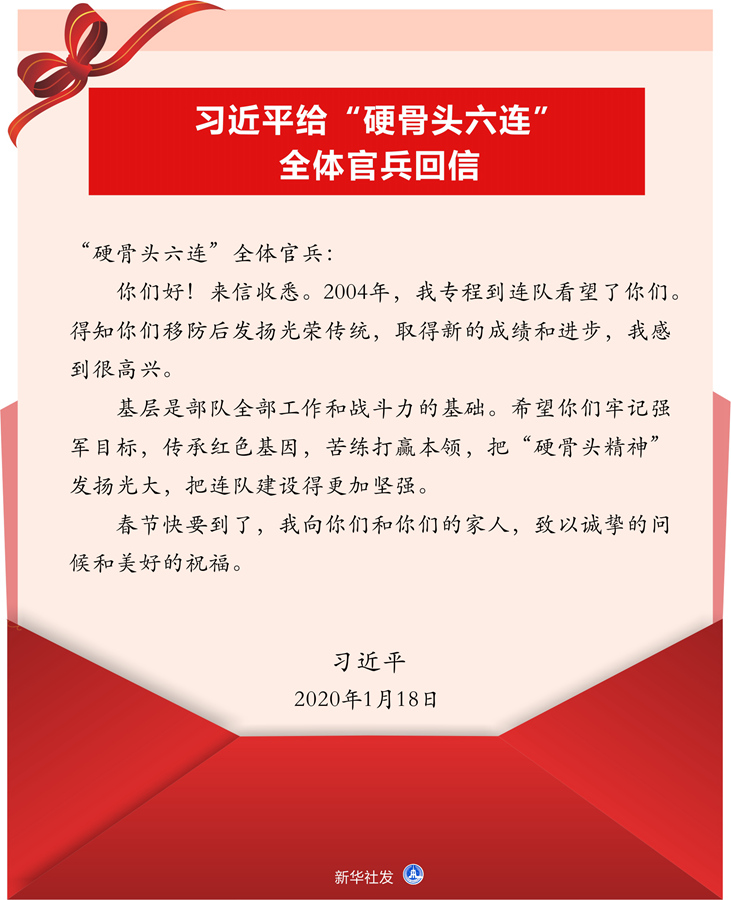 新華社北京1月19日電 中共中央總書記、國(guó)家主席、中央軍委主席習(xí)近平1月18日給74集團(tuán)軍某旅“硬骨頭六連”全體官兵回信,勉勵(lì)他們牢記強(qiáng)軍目標(biāo),傳承紅色基因,苦練打贏本領(lǐng),把“硬骨頭精神”發(fā)揚(yáng)光大,把連隊(duì)建設(shè)得更加堅(jiān)強(qiáng),并向官兵們和他們的家人致以新春祝福?;匦湃娜缦拢?/p>