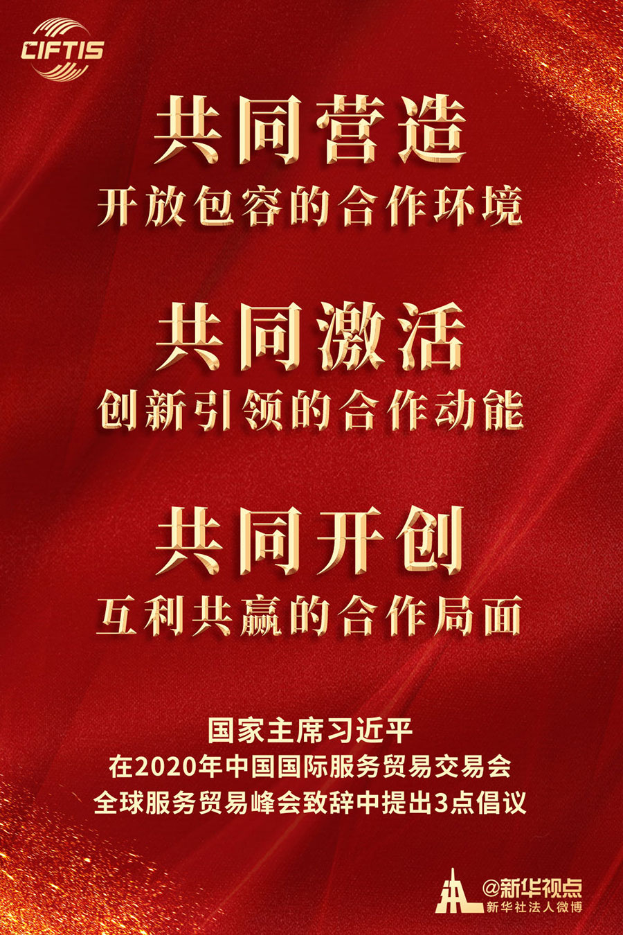“希望以此為契機(jī),搭建起平臺和橋梁,讓各國人民充分展示服務(wù)貿(mào)易領(lǐng)域新發(fā)展新突破,共同享受人類社會(huì)發(fā)展進(jìn)步新技術(shù)新成果?!绷?xí)近平主席在致辭中說。