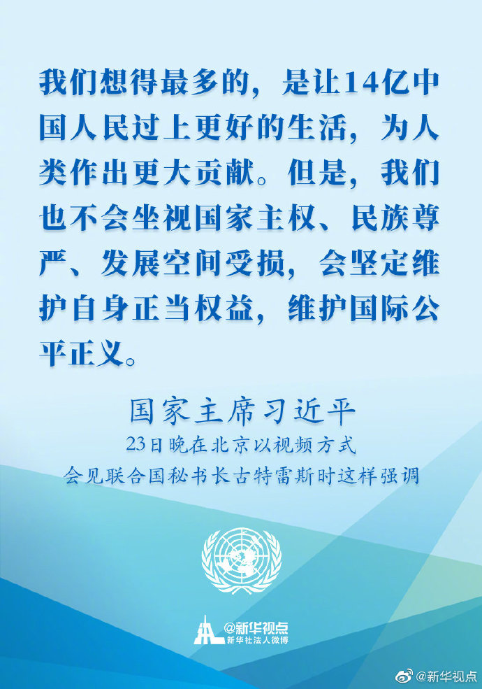 國家主席習近平23日晚在北京以視頻方式會見聯合國秘書長古特雷斯時講話的金句