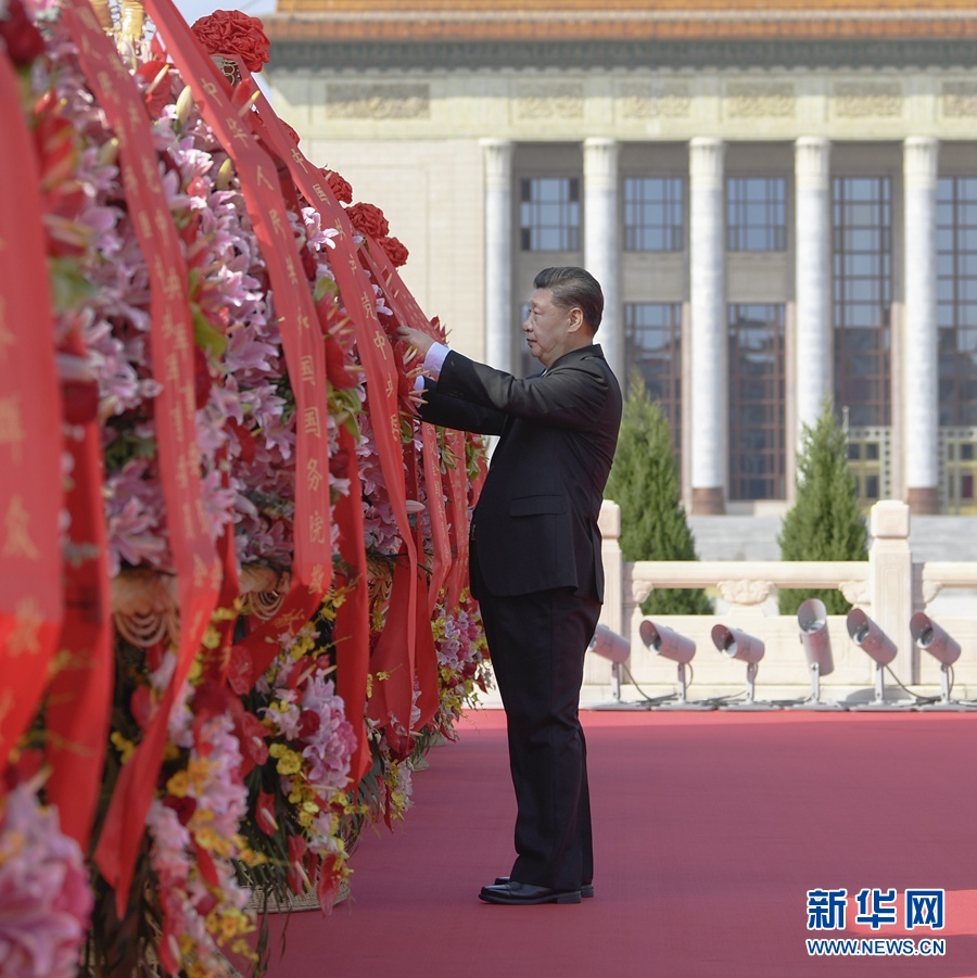 9月30日上午,黨和國(guó)家領(lǐng)導(dǎo)人習(xí)近平、李克強(qiáng)、栗戰(zhàn)書、汪洋、王滬寧、趙樂際、韓正、王岐山等來到北京天安門廣場(chǎng),出席烈士紀(jì)念日向人民英雄敬獻(xiàn)花籃儀式。這是習(xí)近平整理花籃上的緞帶。 新華社記者 申宏 攝