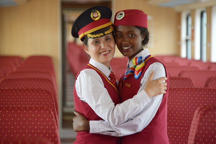 2016年10月1日,在埃塞俄比亞首都亞的斯亞貝巴拉布車站,中方列車長丁繼華(左)和埃塞俄比亞乘務員沃克內(nèi)什·貝特魯擁抱。新華社記者孫瑞博攝