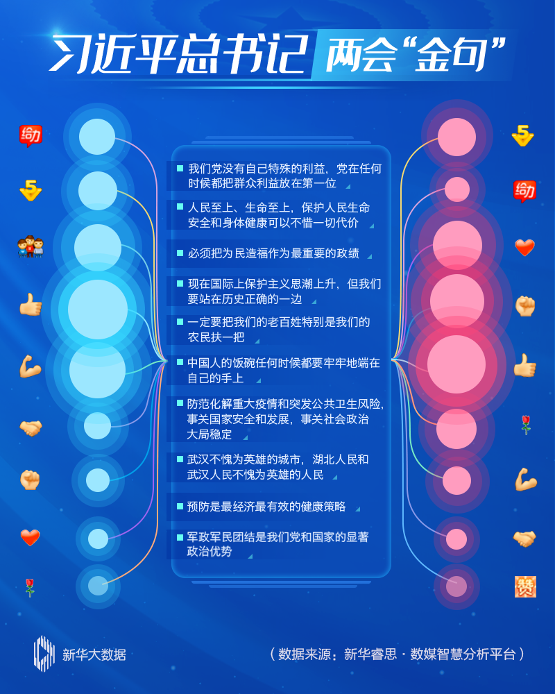 總書記飽含深情的話語(yǔ)一經(jīng)發(fā)出,立刻通過(guò)網(wǎng)絡(luò)傳導(dǎo)觸及每一個(gè)網(wǎng)民的情感神經(jīng),引發(fā)大量情感共鳴。兩會(huì)期間,新華睿思持續(xù)追蹤相關(guān)數(shù)據(jù),并對(duì)網(wǎng)民的情緒變化和留言進(jìn)行集納分析。