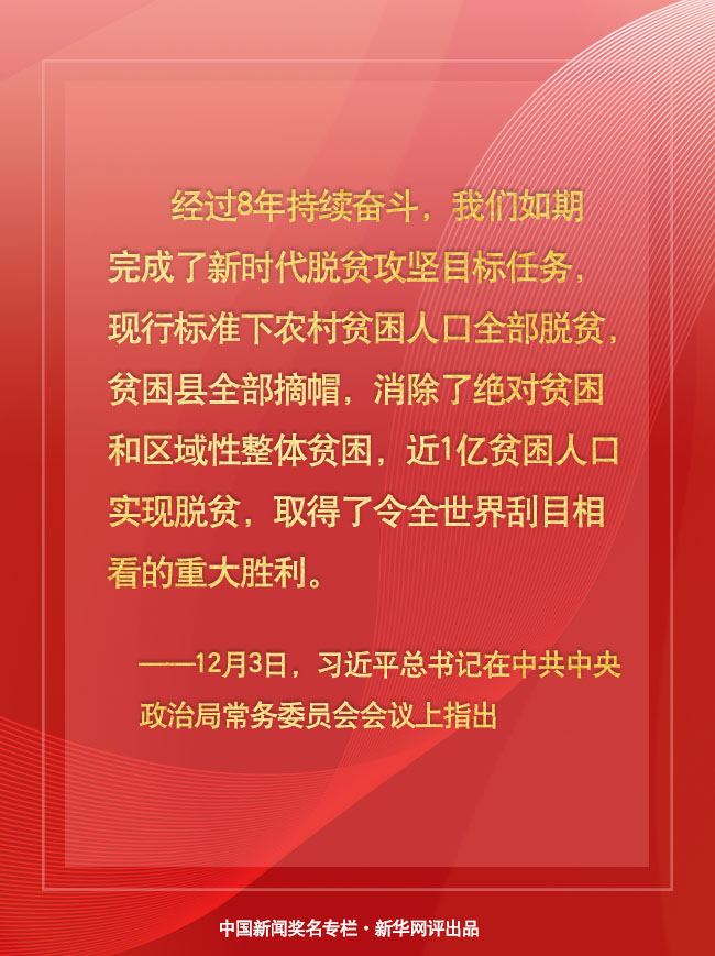中共中央政治局常務(wù)委員會(huì)12月3日召開(kāi)會(huì)議,聽(tīng)取脫貧攻堅(jiān)總結(jié)評(píng)估匯報(bào)。習(xí)近平總書(shū)記在會(huì)上指出,經(jīng)過(guò)8年持續(xù)奮斗,我們?nèi)缙谕瓿闪诵聲r(shí)代脫貧攻堅(jiān)目標(biāo)任務(wù),現(xiàn)行標(biāo)準(zhǔn)下農(nóng)村貧困人口全部脫貧,貧困縣全部摘帽,消除了絕對(duì)貧困和區(qū)域性整體貧困,近1億貧困人口實(shí)現(xiàn)脫貧,取得了令全世界刮目相看的重大勝利。