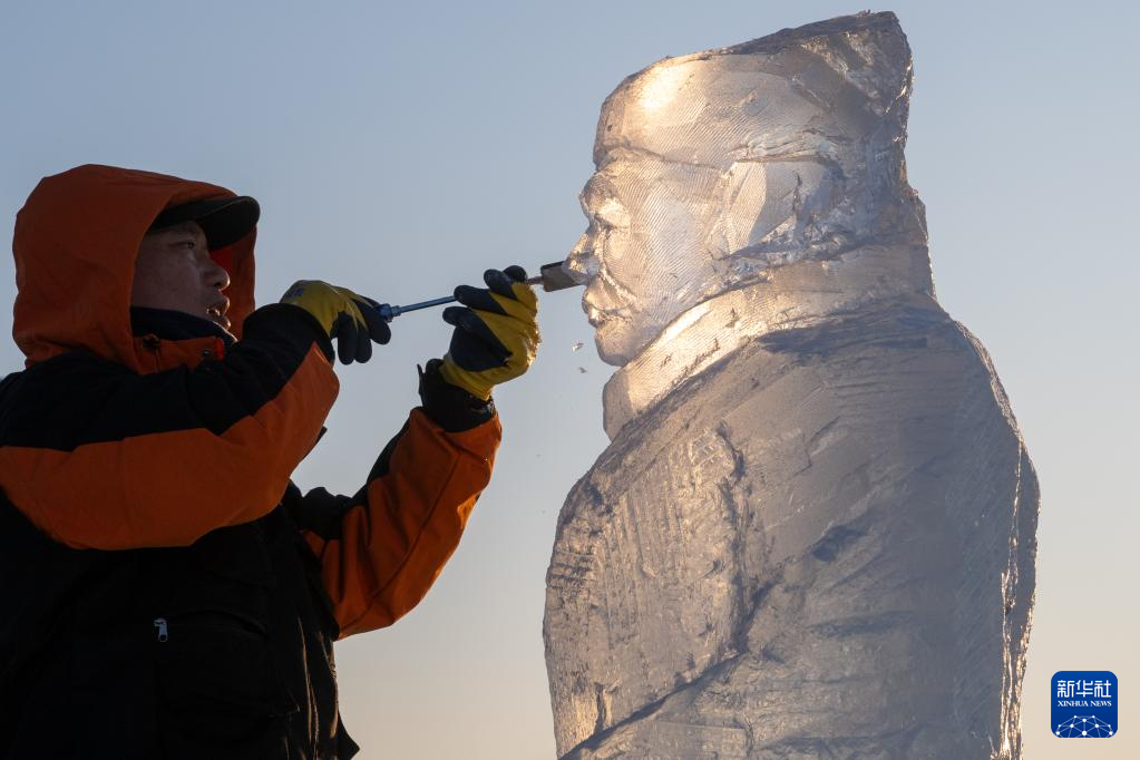 1月4日,在哈尔滨冰雪大世界园区,大庆师范学院美术与设计学院冰雕团队的成员在雕刻“冰马俑”。