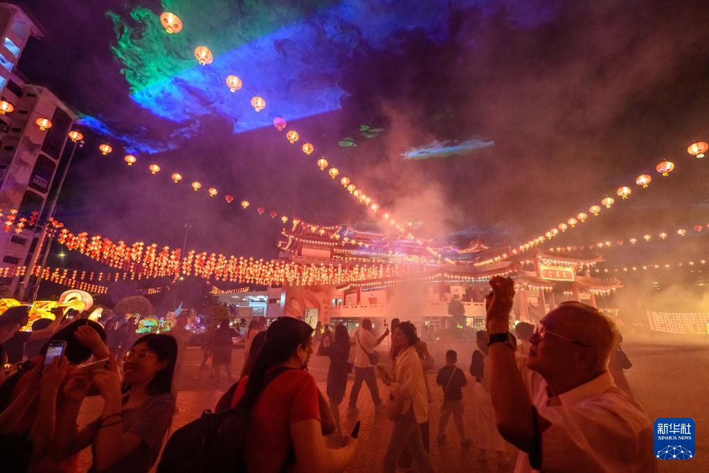 1月21日,在马来西亚吉隆坡天后宫,市民欣赏节日彩灯。