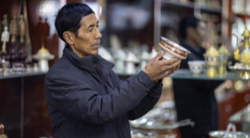 3月8日,在新疆都拉塔口岸房车露营基地,当地群众拍摄放飞的风筝。