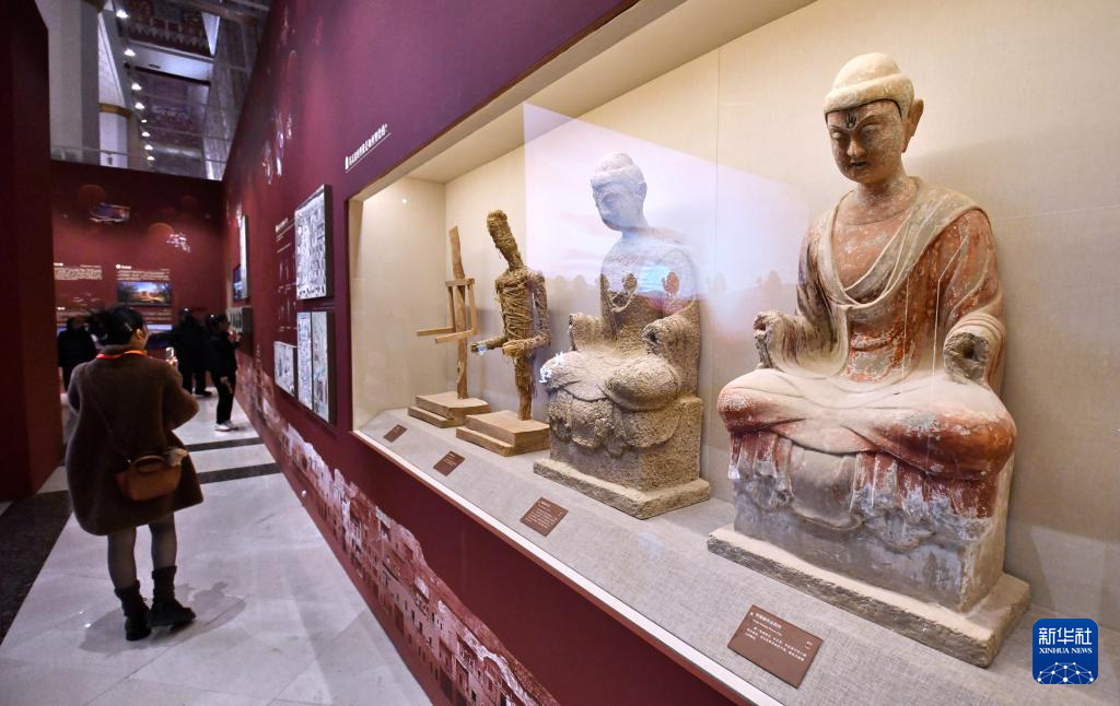 3月29日,观众在参观“如是莫高”敦煌艺术大展中展出的复刻佛像。