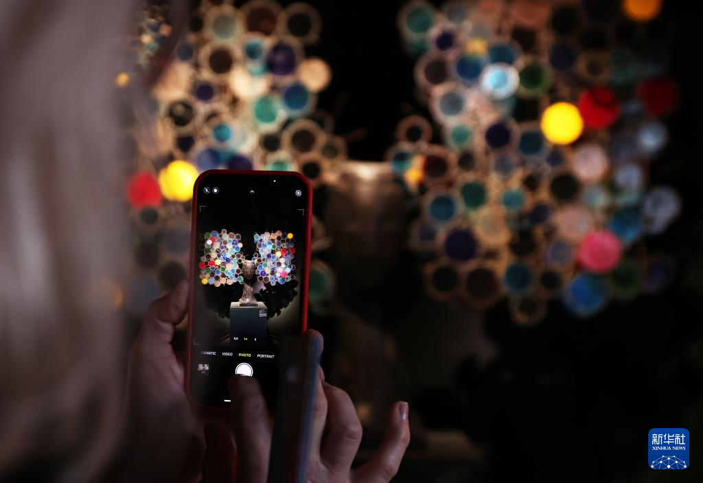 4月6日,一名女子在法国巴黎大皇宫举行的2025年巴黎艺术博览会上为艺术品拍照。