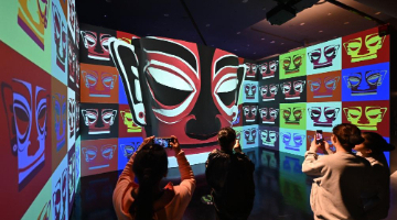4月28日,观众在青岛电影博物馆电影场记板装饰墙前拍摄。
