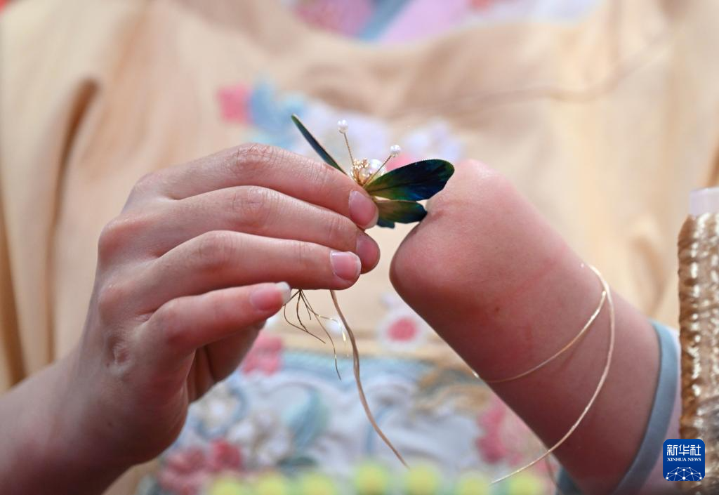 5月17日,残疾人工匠江越在活动现场制作绒花。