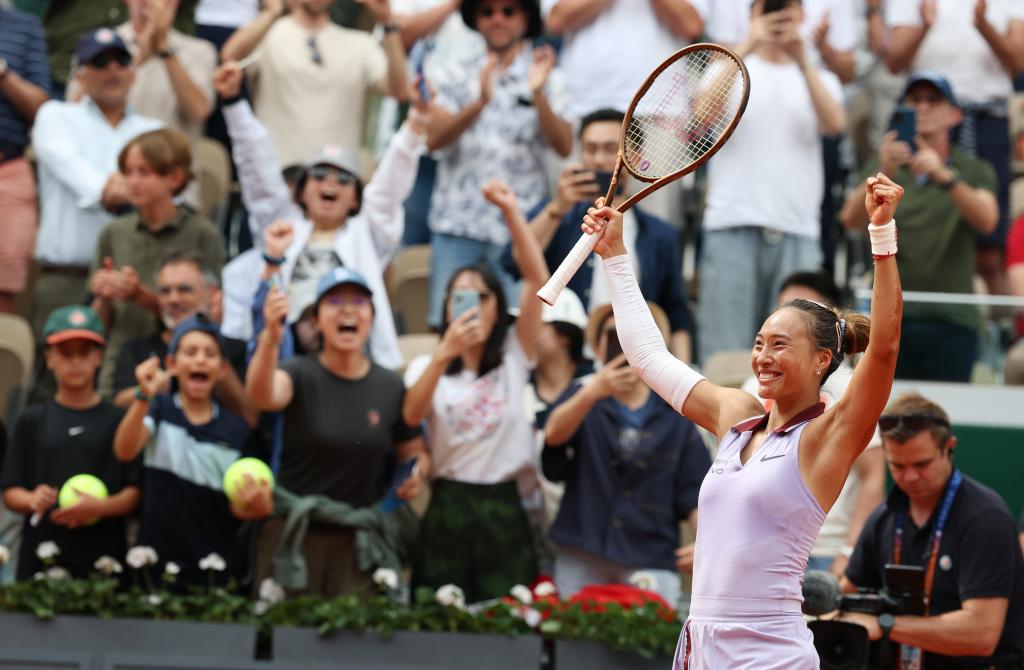 6月1日,郑钦文庆祝职业生涯首次打进法网女单八强。新华社记者 高静 摄