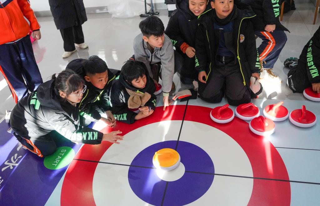 12月3日,吉林市松江东路小学校学生在吉林市纳美山谷度假区体验旱地冰壶。新华社记者 颜麟蕴 摄