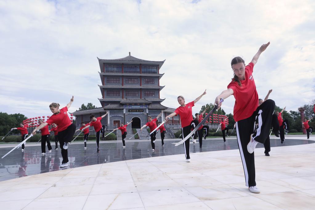 ↑8月16日,拉脱维亚学员在河南焦作市中国太极拳博物馆前练习太极单剑。新华社发(徐宏星摄)