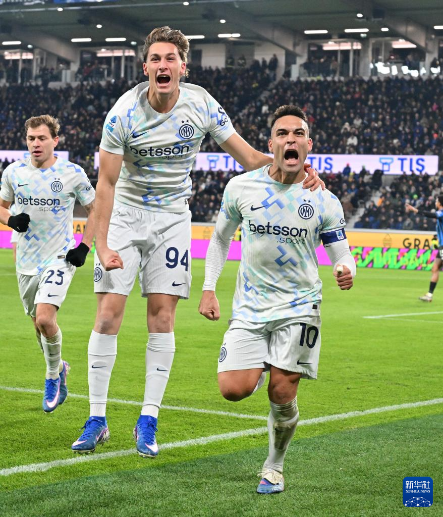 12月28日,国际米兰队球员劳塔罗·马丁内斯(右)与队友埃斯波西托(中)庆祝进球。