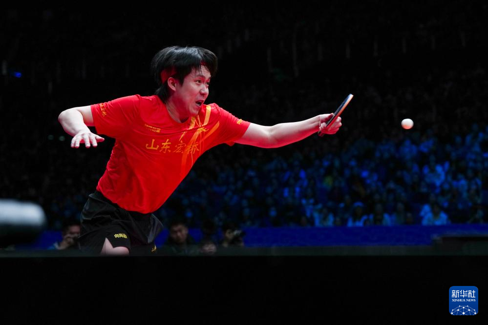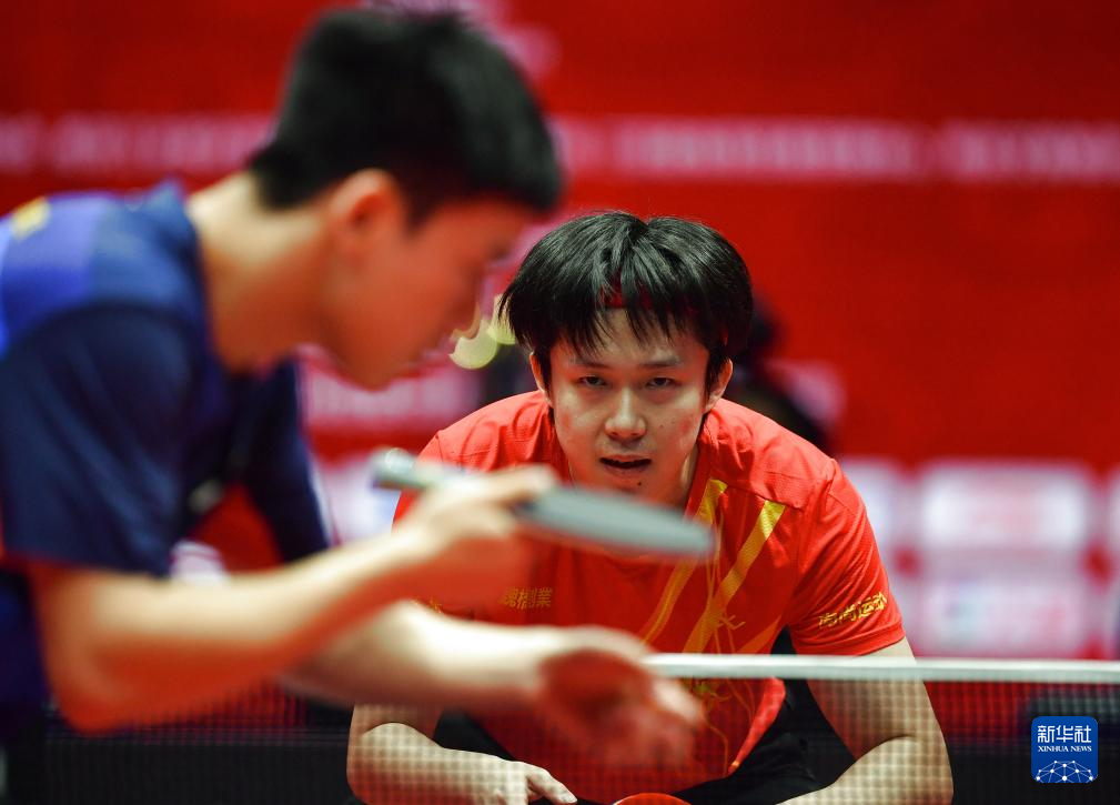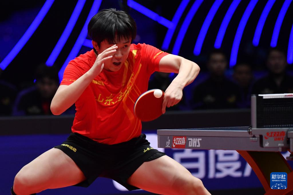 12月28日,山东魏桥·向尚运动队选手王楚钦在单打比赛中回球。他3比1战胜黄石华新队选手向鹏。