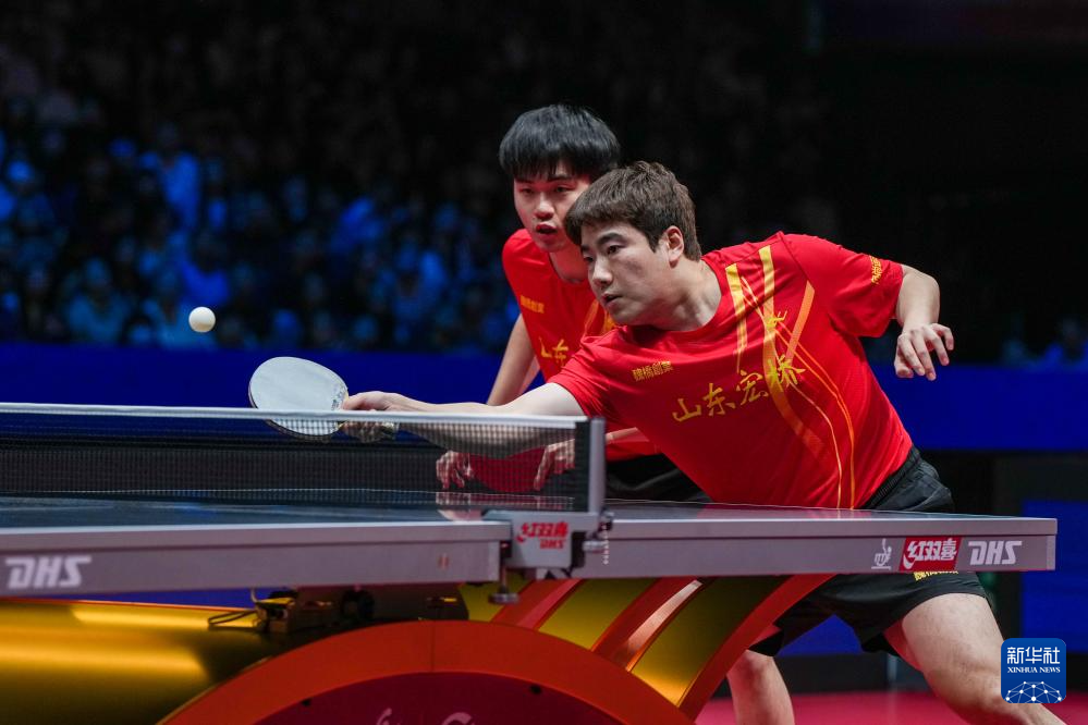 12月28日,山东魏桥·向尚运动队组合梁靖崑(右)/林昀儒在双打比赛中。他们3比0战胜黄石华新队组合薛飞/刘冠成。