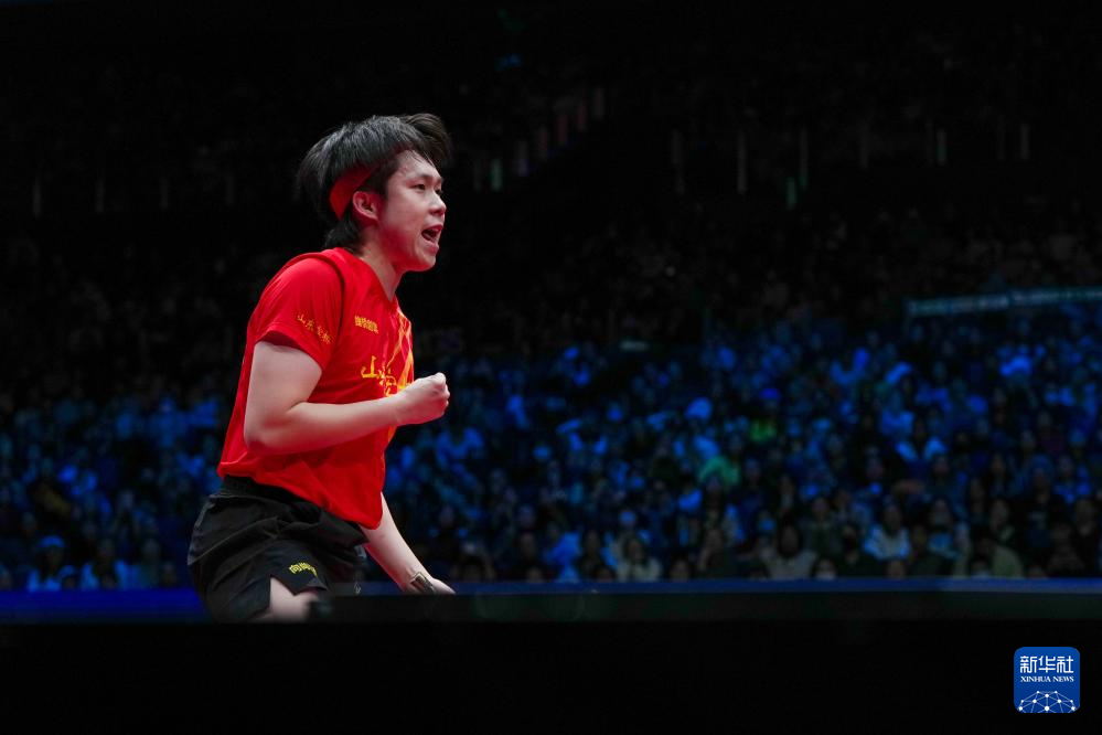 12月28日,山东魏桥·向尚运动队选手王楚钦在单打比赛中庆祝得分。他3比1战胜黄石华新队选手向鹏。