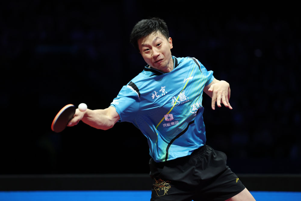 ↑11月20日,北京队选手马龙在第十五届全国运动会乒乓球男子团体金牌赛男单比赛中回球。最终,他3比0战胜上海队选手周恺。