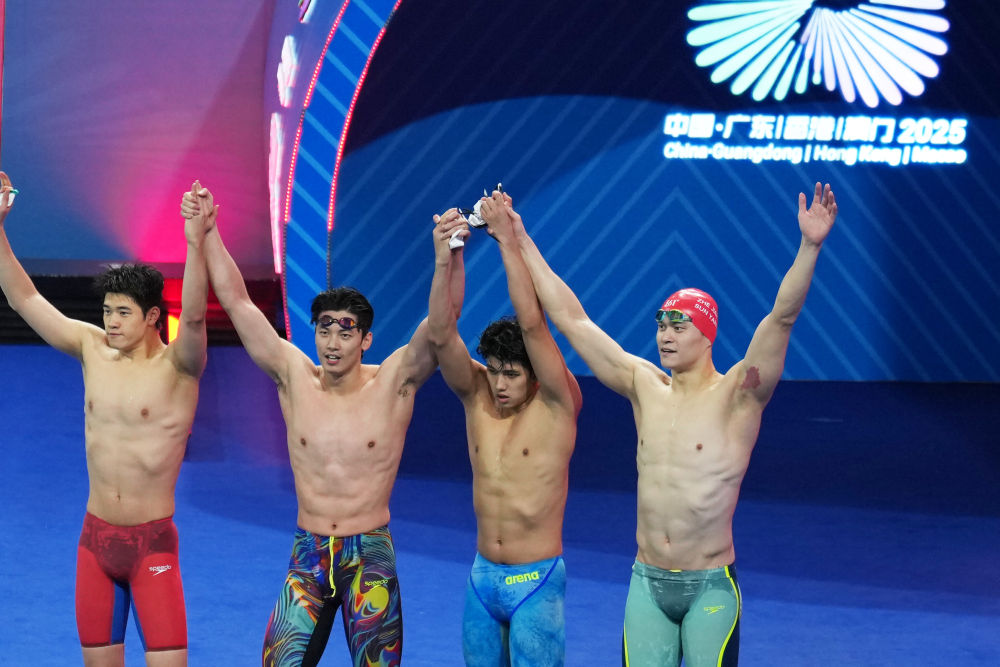↑11月15日,浙江队选手潘展乐、汪顺、费立纬和孙杨(从左至右)在第十五届全国运动会游泳男子4X200米自由泳接力决赛后。浙江队获得亚军。