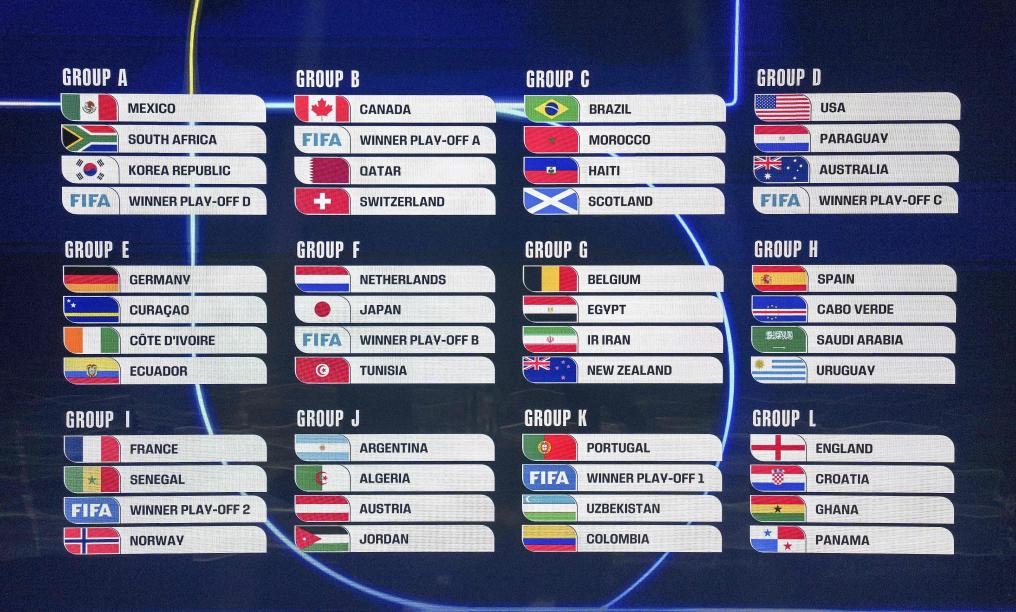 这是12月5日拍摄的2026美加墨世界杯小组赛分组抽签仪式现场大屏幕显示的抽签结果。新华社记者 吴晓凌 摄