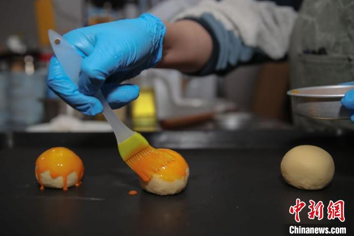 圖為黃婉菁為蛋黃酥刷蛋液。(瞿宏倫 攝)