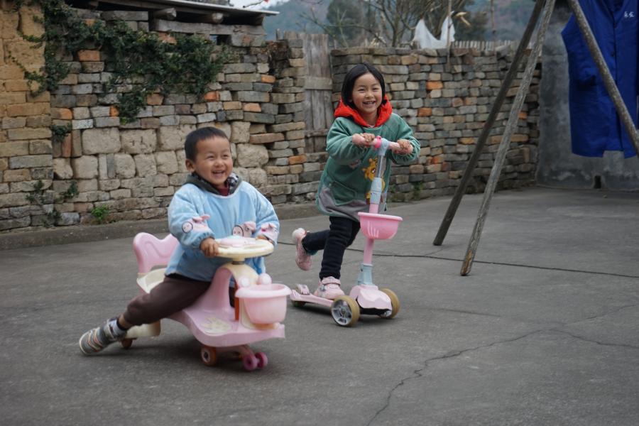 下午,王滿香又來到了另一戶留守兒童家中。剛進(jìn)門,4歲的清伊(化名)和2歲的弟弟就騎著滑板車開心地圍著她轉(zhuǎn)起了圈?!敖裉旃圆还??看看童伴媽媽給你帶了什么禮物?”王滿香拿起手中的粉色書包向小女孩打招呼。