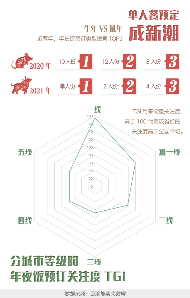 ??? 年夜飯的另外一個新變化是:許多城市上班族調(diào)整了自己的過年返鄉(xiāng)計劃,單人份年夜飯在一線城市受寵?!栋俣?021年貨搜索大數(shù)據(jù)》顯示,相比去年鼠年8-12人居多的年夜飯預(yù)訂類型,今年以4人份、2人份甚至單人份居多。