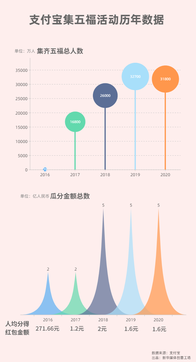 自2016年支付寶推出“集五福”的活動(dòng)至今已有五個(gè)年頭。從最開(kāi)始只有幾十萬(wàn)用戶參與,到如今幾億人共同狂歡。支付寶數(shù)據(jù)顯示,截至2月11日零點(diǎn),支付寶集五福活動(dòng)共寫下近5.7億個(gè)福字,共2.6億網(wǎng)友在線上手寫了福字,送給親朋好友,其中還有350萬(wàn)福字通過(guò)支付寶打印、寄送回家。今年參與紅包拜年的用戶上漲了近270%,“紅包”相關(guān)搜索量也隨之大漲538%。